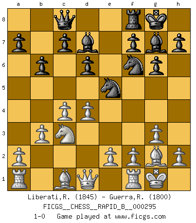 Last move : 1-0 2018 October 26 10:0:21 [Event "FICGS__CHESS__RAPID_B__000295"] [Site "FICGS"] [Date "2018.09.10"] [Round "1"] [White "Liberati,Riccardo"] [Black "Guerra,Rodrigo"] [Result "1-0"] [WhiteElo "1845"] [BlackElo "1800"] 1.c4 Nf6 2.Nc3 e5 3.g3 g6 4.Bg2 Bg7 5.d3 Nc6 6.Nf3 O-O 7.O-O b6 8.Nxe5 Nxe5 9.Bxa8 d6 10.Bg2 Bd7 11.b3 Qc8 12.d4 1-0 This chess game has been lost on time (started : 2018.09.10 10:48:56) English Opening Kingside Castling by player Black (move 6) Kingside Castling by player White (move 7) Player White won this chess game. Follow this game move after move (download)The way he plays Chess demonstrates a man's whole nature. (Stanley Ellin) Ich kenne Menschen, die allen Willen der Welt besitzen und doch nicht Schach spielen können. (Robert James Fischer) Una partida de Ajedrez se divide en 3 etapas: la primera cuando piensas que tienes la ventaja, la segunda cuando crees que tienes la ventaja y la tercera... ¡cuando te das cuenta que vas a perder!. (Savielly Tartakower) Le succès, c'est être capable d'aller d'échec en échec sans perdre son enthousiasme. (Winston Churchill) Wisdom is the reward you get for a lifetime of listening when you'd have preferred to talk. (Doug Larson)