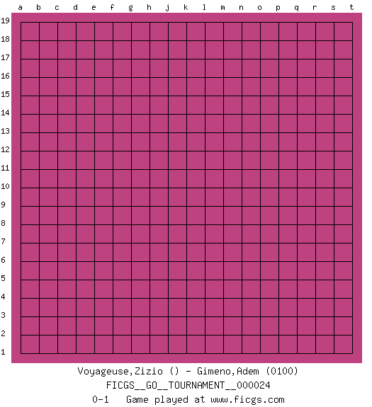 Last move : 0-1 2018 October 10 19:29:7 [Event "FICGS__GO__TOURNAMENT__000024"] [Site "FICGS"] [Date "2018.09.10"] [Round "1"] [Black "Voyageuse,Zizio"] [White "Gimeno,Adem"] [Result "0-1"] [Rating 2 "0100"] 0-1 This go game has been lost on time (started : 2018.09.10 18:54:54) Here are the names of the openings (joseki) played in the four corners : Player White won this Go (weiqi, baduk) game. Follow this game move after move (download)The game plays itself, the players don't control it. (Pierre Audouard) Just because you do not take an interest in politics doesn't mean politics won't take an interest in you. (Pericles 430 B.C.)