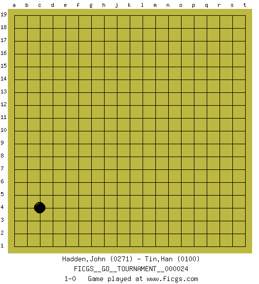 Last move : 1-0 2018 October 10 19:29:7 [Event "FICGS__GO__TOURNAMENT__000024"] [Site "FICGS"] [Date "2018.09.10"] [Round "1"] [Black "Hadden,John"] [White "Tin,Han"] [Result "1-0"] [Rating 1 "0271"] [Rating 2 "0100"] 1.c4 1-0 This go game has been lost on time (started : 2018.09.10 18:54:54) Here are the names of the openings (joseki) played in the four corners : Corner d4 : c4 1-0 Komoku (Somok, Xiao~mu`) 3-4 Point. The komoku (3-4) point is the traditional corner enclosure move.. Player Black won this Go (weiqi, baduk) game. Follow this game move after move (download)On the third line, four die, six live. (Anonymous) Memory is a complicated thing, a relative to truth, but not its twin. (Barbara Kingsolver, Animal Dreams)