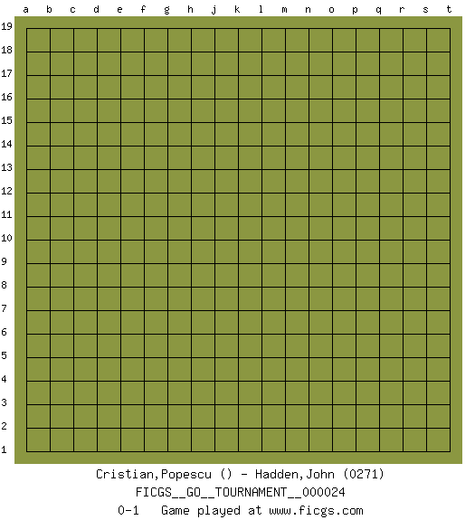 Last move : 0-1 2018 October 10 19:29:7 [Event "FICGS__GO__TOURNAMENT__000024"] [Site "FICGS"] [Date "2018.09.10"] [Round "1"] [Black "Cristian,Popescu"] [White "Hadden,John"] [Result "0-1"] [Rating 2 "0271"] 0-1 This go game has been lost on time (started : 2018.09.10 18:54:54) Here are the names of the openings (joseki) played in the four corners : Player White won this Go (weiqi, baduk) game. Follow this game move after move (download)Always remember, keep the balance. [between territory and influence] (Figaro) Somehow our devils are never quite what we expect when we meet them face to face. (Nelson DeMille)