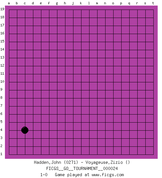 Last move : 1-0 2018 October 10 19:29:7 [Event "FICGS__GO__TOURNAMENT__000024"] [Site "FICGS"] [Date "2018.09.10"] [Round "1"] [Black "Hadden,John"] [White "Voyageuse,Zizio"] [Result "1-0"] [Rating 1 "0271"] 1.c4 1-0 This go game has been lost on time (started : 2018.09.10 18:54:54) Here are the names of the openings (joseki) played in the four corners : Corner d4 : c4 1-0 Komoku (Somok, Xiao~mu`) 3-4 Point. The komoku (3-4) point is the traditional corner enclosure move.. Player Black won this Go (weiqi, baduk) game. Follow this game move after move (download)Eyes win semiais. (Anonymous) Gambling : The sure way of getting nothing from something. (Wilson Mizner)