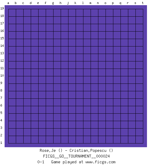 Last move : 0-1 2018 October 10 19:29:7 [Event "FICGS__GO__TOURNAMENT__000024"] [Site "FICGS"] [Date "2018.09.10"] [Round "1"] [Black "Rose,Je"] [White "Cristian,Popescu"] [Result "0-1"] 0-1 This go game has been lost on time (started : 2018.09.10 18:54:54) Here are the names of the openings (joseki) played in the four corners : Player White won this Go (weiqi, baduk) game. Follow this game move after move (download)Fighting must not be the key to go, it should be reserved as your last resource. (Zhong-Pu Liu, about Weiqi) Begin at the beginning and go on till you come to the end; then stop. (Lewis Carrol, Alice in Wonderland)