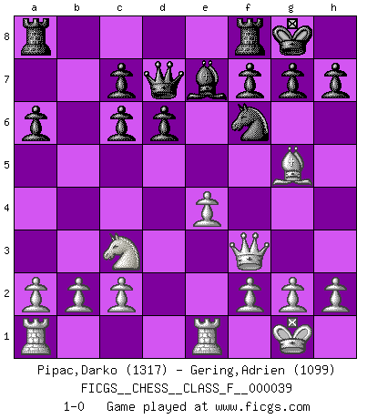 Last move : 1-0 2007 August 4 14:1:48 [Event "FICGS__CHESS__CLASS_F__000039"] [Site "FICGS"] [Date "2007.05.18"] [Round "1"] [White "Pipac,Darko"] [Black "Gering,Adrien"] [Result "1-0"] [WhiteElo "1317"] [BlackElo "1099"] 1.e4 e5 2.Nf3 Nc6 3.Nc3 Nf6 4.Bb5 a6 5.Ba4 d6 6.d4 exd4 7.Nxd4 Bd7 8.Nxc6 Bxc6 9.Bxc6+ bxc6 10.O-O Be7 11.Qf3 O-O 12.Re1 Qd7 13.Bg5 1-0 Four knights : Spanish variation Kingside Castling by player White (move 10) Kingside Castling by player Black (move 11) Player White won this chess game. Follow this game move after move (download)You need not play well - just help your opponent to play badly. (Genrikh Chepukaitis) Die FIDE ist dabei in die Hände der russischen Mafia zu fallen. (Larry Evans) Con o sin el título, Bobby Fischer fue sin lugar a dudas el mas grande jugador de su época. (Burt Hochberg) Le génie consiste à savoir transgresser les règles au moment opportun. (Teichmann) Waiting for chance ? Play in casinos. (FICGS proverb)