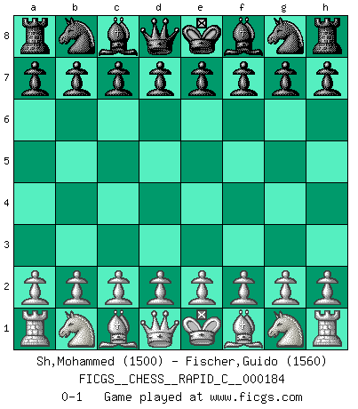 Last move : 0-1 2018 October 10 19:29:7 [Event "FICGS__CHESS__RAPID_C__000184"] [Site "FICGS"] [Date "2018.09.10"] [Round "1"] [White "Sh,Mohammed"] [Black "Fischer,Guido"] [Result "0-1"] [WhiteElo "1500"] [BlackElo "1560"] 0-1 This chess game has been lost on time (started : 2018.09.10 18:55:16) Player Black won this chess game. Follow this game move after move (download)Even the laziest King flees wildly in the face of a double check ! (Aaron Nimzowitsch) Oft bringt ein stiller Zug das Erdbeben. (Richard Reti) La belleza de un movimiento no se refleja solo en su apariencia, sino en el pensamiento detrás de él. (Siegbert Tarrasch) Les Echecs mettent en conflit, non pas deux intelligences, mais deux volontés. (Lasker) There are lots of people who mistake their imagination for their memory. (Josh Bilings)