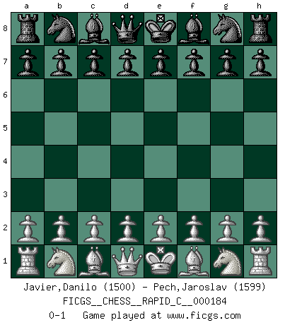 Last move : 0-1 2018 October 10 19:29:7 [Event "FICGS__CHESS__RAPID_C__000184"] [Site "FICGS"] [Date "2018.09.10"] [Round "1"] [White "Javier,Danilo"] [Black "Pech,Jaroslav"] [Result "0-1"] [WhiteElo "1500"] [BlackElo "1599"] 0-1 This chess game has been lost on time (started : 2018.09.10 18:55:16) Player Black won this chess game. Follow this game move after move (download)Play the opening like a book, the middle game like a magician, and the endgame like a machine. (Spielmann) Charakterschwächen offenbaren sich normalerweise während einer Schachpartie. (Garry Kasparov) Cuando tu casa esta en llamas, no puedes ser molestado por tus vecinos. O, como decinos en Ajedrez, si tu Rey esta bajo ataque, no te preocupa perder un Peón del lado de la Reina. (Gary Kasparov) Mon pion favori sur ma case favorite ! Bronstein en parlant d'un coup de pion en h5 quand il avait les Noirs. When I took office, only high energy physicists had ever heard of what is called the World Wide Web... Now even my cat has its own page. (Bill Clinton, 1996)