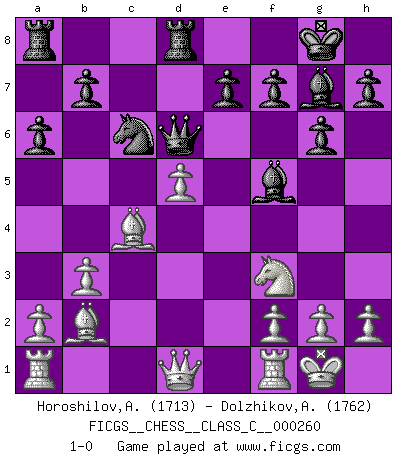 Last move : 1-0 2018 December 12 13:24:53 [Event "FICGS__CHESS__CLASS_C__000260"] [Site "FICGS"] [Date "2018.09.11"] [Round "1"] [White "Horoshilov,Andrey"] [Black "Dolzhikov,Aleksandr"] [Result "1-0"] [WhiteElo "1713"] [BlackElo "1762"] 1.d4 Nf6 2.c4 g6 3.Nc3 d5 4.e3 Bg7 5.Nf3 O-O 6.Be2 c5 7.cxd5 Nxd5 8.Nxd5 Qxd5 9.b3 Nc6 10.O-O a6 11.Ba3 Rd8 12.Bb2 cxd4 13.exd4 Bf5 14.Bc4 Qd6 15.d5 1-0 King's Indian defense, 3.Nc3 Kingside Castling by player Black (move 5) Kingside Castling by player White (move 10) Player White won this chess game. Follow this game move after move (download)Help your pieces so they can help you. (Paul Morphy) Sehr viele beherrschen heutzutage das große Einmalseins des Schachspiels und kennen sogar dessen Logarithmentafeln auswendig - deshalb sollte man hin und wieder zu beweisen trachten, dass zwei mal zwei auch fünf sein kann. (Mikhail Nekhemyevich Tal) El Ajedrez es un regaderazo frío para la mente. (Sir John Simon) D'abord les bases : Jouez et étudiez, puis étudiez et jouez, ensuite jouez et étudiez, puis étudiez et jouez. Deuxièmement : Donnez toujours le meilleur de vous-même ! (Ken Smith) The bottom line is always the bottom line. (Johann Piek)