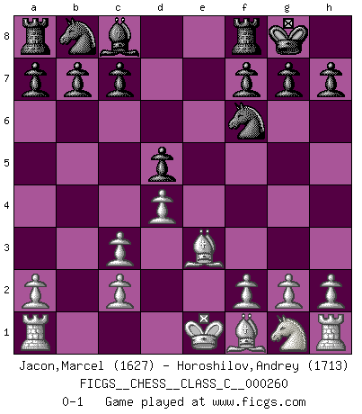 Last move : 0-1 2018 November 5 21:54:52 [Event "FICGS__CHESS__CLASS_C__000260"] [Site "FICGS"] [Date "2018.09.11"] [Round "1"] [White "Jacon,Marcel"] [Black "Horoshilov,Andrey"] [Result "0-1"] [WhiteElo "1627"] [BlackElo "1713"] 1.e4 e6 2.Nc3 d5 3.exd5 exd5 4.d4 Bb4 5.Bd2 Nf6 6.Qf3 Qe7+ 7.Qe3 Qxe3+ 8.Bxe3 Bxc3+ 9.bxc3 O-O 0-1 This chess game has been lost on time (started : 2018.09.11 19:51:1) French defense Kingside Castling by player Black (move 9) Player Black won this chess game. Follow this game move after move (download)There is no remorse like the remorse of Chess. (H. G. Wells) Das Schachspiel ist ein See, in welchem eine Mücke baden und ein Elefant ertrinken kann. (Emanuel Lasker) Observen a Garry Kasparov. Después de una derrota, invariablemente el gana la próxima partida. Prácticamente hace pedazos a su siguiente oponente. Eso es algo que tenemos que aprender a lograr. (Maurice Ashley) Pour moi, les échecs ne sont pas un jeu mais un art. (Alexandre Alekhine) The problem with manipulation is that people can turn on you. (Horatio Caine, C.S.I. Miami)