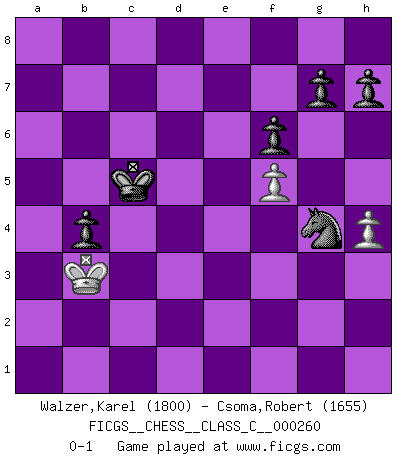Last move : 0-1 2018 November 4 23:35:29 [Event "FICGS__CHESS__CLASS_C__000260"] [Site "FICGS"] [Date "2018.09.11"] [Round "1"] [White "Walzer,Karel"] [Black "Csoma,Robert"] [Result "0-1"] [WhiteElo "1800"] [BlackElo "1655"] 1.d4 Nf6 2.Nf3 d5 3.g3 c5 4.dxc5 Qa5+ 5.c3 Qxc5 6.b4 Qc7 7.Bb2 Bf5 8.Nbd2 e5 9.Nh4 Be6 10.Bg2 Nbd7 11.Qa4 Be7 12.O-O O-O 13.b5 a6 14.c4 axb5 15.Qxb5 Ra5 16.Qb3 Nc5 17.Qc2 Rfa8 18.Bc3 Ra4 19.Bxd5 Bxd5 20.cxd5 Nxd5 21.Bb2 Rxa2 22.Rxa2 Rxa2 23.Nc4 Bxh4 24.Qf5 Bf6 25.Bxe5 Bxe5 26.Qxe5 Qxe5 27.Nxe5 f6 28.Nd3 Nxd3 29.exd3 Rd2 30.Rb1 b6 31.Rb3 Kf7 32.Kg2 Ke6 33.g4 Kd6 34.Ra3 Nf4+ 35.Kf3 Rxd3+ 36.Rxd3+ Nxd3 37.Ke2 Ne5 38.h3 b5 39.Kd2 Kc5 40.Kc3 b4+ 41.Kb3 Nd3 42.f3 Ne5 43.f4 Nd3 44.f5 Nf2 45.h4 Nxg4 0-1 Queen's pawn game Kingside Castling by player White (move 12) Kingside Castling by player Black (move 12) 10 pieces endgame at move 36 : White KPPP , Black KNPPPP WHITE : King + 3 Pawns BLACK : King + 1 Knight 4 Pawns 9 pieces endgame at move 45 : White KPP , Black KNPPPP WHITE : King + 2 Pawns BLACK : King + 1 Knight 4 Pawns Player Black won this chess game. Follow this game move after move (download)My God, Bobby Fischer plays so simply. (Alexei Suetin) Ich verstehe den Grund nicht, warum die Aufteilung in Frauen und Männer überhaupt im Schach besteht. (Judith Polgar) Los tropiezos estan todos ahí en el tablero, esperando que se cometan. (Savielly Tartakover) Le génie consiste à savoir transgresser les règles au moment opportun. (Teichmann) When a man with money meets a man with experience, the man with experience leaves with money and the man with money leaves with experience. (Anonymous)