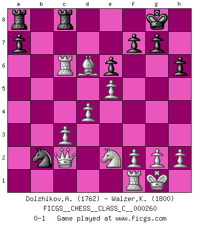 Last move : 0-1 2018 October 10 16:31:46 [Event "FICGS__CHESS__CLASS_C__000260"] [Site "FICGS"] [Date "2018.09.11"] [Round "1"] [White "Dolzhikov,Aleksandr"] [Black "Walzer,Karel"] [Result "0-1"] [WhiteElo "1762"] [BlackElo "1800"] 1.d4 d5 2.c4 c6 3.Nc3 e6 4.e4 dxc4 5.Bxc4 Bd6 6.e5 Bb4 7.Nge2 Ne7 8.O-O O-O 9.a3 Bxc3 10.bxc3 b5 11.Bd3 Ba6 12.Bg5 h6 13.Bh4 Nd7 14.a4 Qb6 15.Bxe7 Rfe8 16.Bd6 bxa4 17.Bxa6 Qxa6 18.Rxa4 Nb6 19.Rxa6 Nc4 20.Rxc6 Nb2 21.Qc2 Rec8 0-1 QGD Slav defense Kingside Castling by player White (move 8) Kingside Castling by player Black (move 8) Player Black won this chess game. Follow this game move after move (download)The winner of the game is the player who makes the next-to-last mistake. (Savielly Tartakover) Mit Schach schule ich mein Gefühl für Geometrie, was für Tennis und Schach gleichermaßen wichtig ist. (Boris Becker) Un mal plan es mejor que no tener ningún plan. (Frank Marshall) On n'a jamais que l'âge auquel on a commence à jouer aux échecs car après on cesse de vieillir. (Capablanca) The Internet is the world's largest library. It's just that all the books are on the floor. (John Allen Paulos)