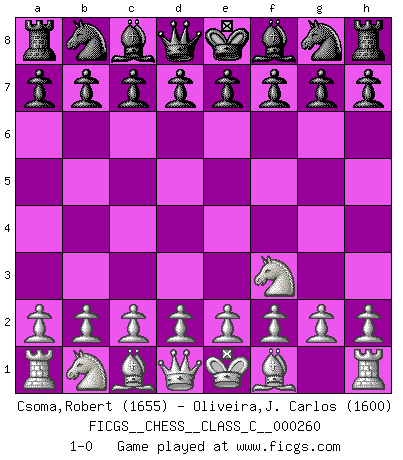 Last move : 1-0 2018 October 23 21:52:54 [Event "FICGS__CHESS__CLASS_C__000260"] [Site "FICGS"] [Date "2018.09.11"] [Round "1"] [White "Csoma,Robert"] [Black "Oliveira,J. Carlos"] [Result "1-0"] [WhiteElo "1655"] [BlackElo "1600"] 1.Nf3 1-0 This chess game has been lost on time (started : 2018.09.11 19:51:1) Reti Opening Player White won this chess game. Follow this game move after move (download)We must make sure that Chess will not be like a dead language, very interesting, but for a very small group. (Sytze Faber) Früher wurde jeder komplizierte Zug, jedes interessante Opfer mit großem Beifall und Enthusiasmus aufgenommen. Heute schaltet man einfach seinen Fritz an, und man kann sehen, was los ist, ob der Zug geht oder nicht. (Vladimir Kramnik) Jugadores de primera clase pierden en contra de jugadores de segunda clase porque los jugadores de segunda clase a veces juegan una partida de primer clase. (Siegbert Tarrasch) Les Echecs mettent en conflit, non pas deux intelligences, mais deux volontés. (Lasker) Vladimir Ras-Putin is still alive... He is also a good actor, I saw him in the Lord of the Rings. (Rodolfo d'Ettorre)