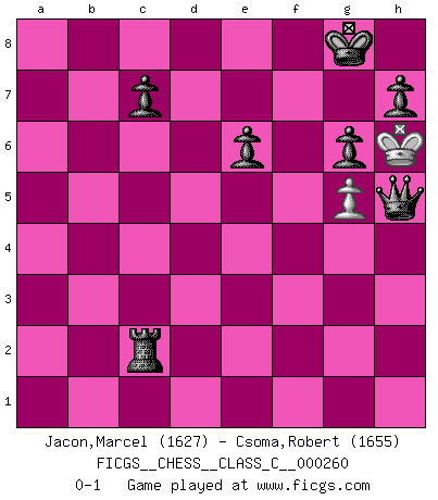 Last move : 0-1 2018 December 11 18:56:24 [Event "FICGS__CHESS__CLASS_C__000260"] [Site "FICGS"] [Date "2018.09.11"] [Round "1"] [White "Jacon,Marcel"] [Black "Csoma,Robert"] [Result "0-1"] [WhiteElo "1627"] [BlackElo "1655"] 1.e4 d6 2.Nf3 Nf6 3.e5 dxe5 4.Nxe5 Qd5 5.Qe2 Nc6 6.d3 Qxe5 7.Qxe5 Nxe5 8.Bg5 e6 9.Be2 Be7 10.Bxf6 Bxf6 11.O-O O-O 12.Nc3 Bd7 13.Ne4 Be7 14.d4 Nc6 15.Nc5 Bxc5 16.dxc5 Nd4 17.Bd3 Rad8 18.Be4 Bc6 19.Bxc6 Nxc6 20.a4 Rd2 21.Rfc1 Nd4 22.a5 Ne2+ 23.Kh1 Nxc1 24.Rxc1 Rfd8 25.h4 Rd1+ 26.Rxd1 Rxd1+ 27.Kh2 Rd2 28.f4 Rxc2 29.b4 b6 30.axb6 axb6 31.Kh3 bxc5 32.g3 cxb4 33.Kg4 b3 34.f5 b2 35.Kh5 b1Q 36.g4 g6+ 37.Kh6 Qc1+ 38.g5 Qd1 39.fxg6 fxg6 40.h5 Qxh5+ 0-1 King's pawn Opening Kingside Castling by player White (move 11) Kingside Castling by player Black (move 11) Promotion Queen by player Black (move 35) 10 pieces endgame at move 39 : White KPP , Black KQRPPPP WHITE : King + 2 Pawns BLACK : King + 1 Queen 1 Rook 4 Pawns 9 pieces endgame at move 40 : White KP , Black KQRPPPP WHITE : King + 1 Pawn BLACK : King + 1 Queen 1 Rook 4 Pawns Player Black won this chess game. Follow this game move after move (download)You can only get good at Chess if you love the game. (Bobby Fischer) Schach ist ein Reich, wo sich die menschliche Phantasie frei entfalten kann. (David Bronstein) Yo no le temo a Spassky. Todos saben que yo soy el mejor. Uno no necesita un torneo para probarlo. (Bobby Fischer) Echiquier : carré parfait, comme la Jérusalem nouvelle décrite par l'auteur de l'Apocalypse, huit cases sur huit, exaltation du chiffre 4, symbole du cosmos aux quatre horizons... où le noir et le blanc, l'ombre et la lumière, le mal et le bien s'entremêlent et se conjuguent. (Robert Couffignal, Le Gambit du poète) Drag your thoughts away from your troubles... by the ears, by the heels, or any other way you can manage it. (Mark Twain)