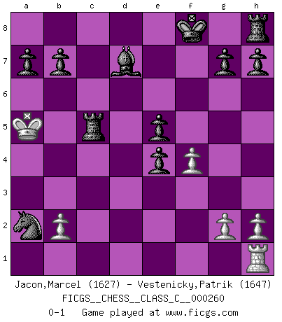 Last move : 0-1 2018 September 21 23:3:18 [Event "FICGS__CHESS__CLASS_C__000260"] [Site "FICGS"] [Date "2018.09.11"] [Round "1"] [White "Jacon,Marcel"] [Black "Vestenicky,Patrik"] [Result "0-1"] [WhiteElo "1627"] [BlackElo "1647"] 1.d4 d5 2.e4 dxe4 3.Qe2 Qxd4 4.Nc3 Nc6 5.Qd2 e5 6.Qxd4 Nxd4 7.Be3 Nxc2+ 8.Kd2 Nxa1 9.Nxe4 f5 10.Bb5+ c6 11.Bc5 fxe4 12.Ne2 Nb3+ 13.Kc2 Nf6 14.Bxf8 Kxf8 15.Kxb3 cxb5 16.f4 Be6+ 17.Kb4 Nd5+ 18.Kxb5 Rc8 19.Nc3 Nxc3+ 20.Kb4 Nxa2+ 21.Kb5 Bd7+ 22.Ka5 Rc5+ 0-1 Blackmar gambit Player Black won this chess game. Follow this game move after move (download)Human affairs are like a Chess game: only those who do not take it seriously can be called good players. (Hung Tzu Ch'eng) Kombinieren und Schwarzhandel gehören verboten. (Savielly Grigorievitsch Tartakower) Una compensación adecuada por un sacrificio es tener una combinación sólida que conduce a una posición ganadora; una compensación adecuada por una metida de pata es dejar a tu oponente arrebatar una derrota de las fauces de la victoria. (Bruce A. Moon) La tactique est l'élément le plus important du milieu de jeu. (Siegbert Tarrasch) First of all, we have to go back to the classical time control. (Anatoly Karpov)