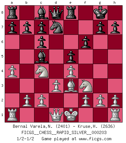 Last move : 1/2-1/2 2018 September 22 18:54:16 [Event "FICGS__CHESS__RAPID_SILVER__000203"] [Site "FICGS"] [Date "2018.09.12"] [Round "2"] [White "Bernal Varela,Nelson"] [Black "Kruse,Herbert"] [Result "1/2-1/2"] [WhiteElo "2401"] [BlackElo "2636"] 1.e4 e5 2.Nf3 Nc6 3.Bb5 Nf6 4.d3 Bc5 5.Bxc6 dxc6 6.Nbd2 O-O 7.Nc4 Re8 8.a4 Nd7 9.Be3 f6 1/2-1/2 Ruy Lopez : Berlin defense Kingside Castling by player Black (move 6) This chess game ended in a draw. Follow this game move after move (download)Avoid the crowd. Do your own thinking independently. Be the Chess player, not the Chess piece. (Ralph Charell) Ich würde die 30 stärksten Spieler der USA im Simultanspiel besiegen. (José Raúl Capablanca) Los libros de Ajedrez deben de usarse igual como usamos los anteojos: para mejorar la vista, aunque algunos jugadores los quieren usar como si ellos les otorgaran la vision. (José Raúl Capablanca) Ce qui est bien, c'est d'avoir tout un tas de pièces en prise : l'adversaire ne peut en prendre qu'une à la fois. Cité par Thierry Audin. If you have any trouble condescending, find a Unix user to show you how it's done. (Scott Adams)