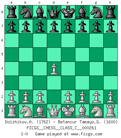 Last move : 1-0 2018 October 24 9:52:24 [Event "FICGS__CHESS__CLASS_C__000261"] [Site "FICGS"] [Date "2018.09.12"] [Round "1"] [White "Dolzhikov,Aleksandr"] [Black "Betancur Tamayo,Gilberto Hernan"] [Result "1-0"] [WhiteElo "1762"] [BlackElo "1600"] 1.d4 1-0 This chess game has been lost on time (started : 2018.09.12 15:16:4) Queen's pawn Player White won this chess game. Follow this game move after move (download)Chess makes man wiser and clear-sighted. (Vladimir Putin) Es ist peinlich, dass ich nie Weltmeister wurde. Es wäre leicht, Leonid Breschnjew als Ursache vorzuschieben, dessen Apparat den Vorzeigekommunisten Anatoli Karpow in allem unterstützte. Aber Garri Kasparow zum Beispiel, der ebenfalls von den Sowjets unerwünscht war, hat trotz der Widerstände den WM-Titel erobert. (Viktor Kortschnoi) Yo no le temo a Spassky. Todos saben que yo soy el mejor. Uno no necesita un torneo para probarlo. (Bobby Fischer) Karpov est une pièce de musée. (Garry Kasparov) The only sure thing about luck is that it will change. (Wilson Mizner)