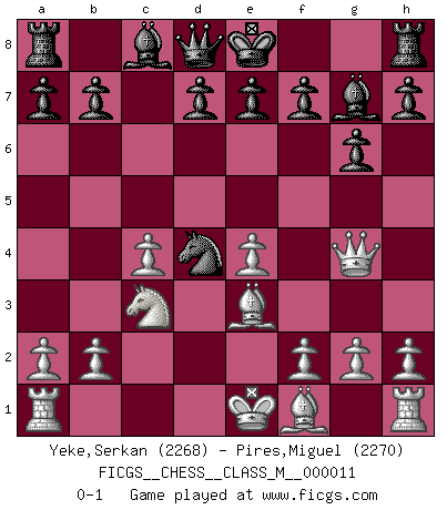 Last move : 0-1 2007 July 28 7:9:48 [Event "FICGS__CHESS__CLASS_M__000011"] [Site "FICGS"] [Date "2007.05.19"] [Round "1"] [White "Yeke,Serkan"] [Black "Pires,Miguel"] [Result "0-1"] [WhiteElo "2268"] [BlackElo "2270"] 1.Nf3 c5 2.c4 g6 3.d4 Bg7 4.e4 cxd4 5.Nxd4 Nc6 6.Be3 Nh6 7.Nc3 Ng4 8.Qxg4 Nxd4 0-1 This chess game has been lost on time (started : 2007.05.19 1:20:45) Reti Opening Player Black won this chess game. Follow this game move after move (download)Life is like a game of Chess, changing with each move. (Chinese proverb) Schach ist ein Reich, wo sich die menschliche Phantasie frei entfalten kann. (David Bronstein) Fischer no está bajo la obligación de nadie. (Joseph Platz) Les échecs sont un jeu terrible. Si vous n'avez pas le centre, votre adversaire a une position plus libre. Par contre, si vous avez le centre, alors vous avez vraiment quelque chose pour laquelle vous inquiéter ! (Siegbert Tarrasch) There are two types of people in this world, good and bad. The good sleep better, but the bad seem to enjoy the waking hours much more. (Woody Allen)