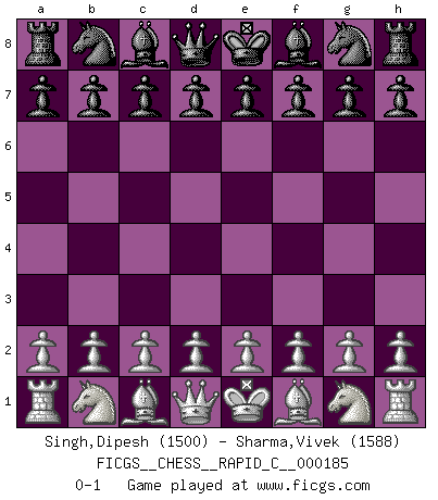 Last move : 0-1 2018 October 14 8:37:46 [Event "FICGS__CHESS__RAPID_C__000185"] [Site "FICGS"] [Date "2018.09.13"] [Round "1"] [White "Singh,Dipesh"] [Black "Sharma,Vivek"] [Result "0-1"] [WhiteElo "1500"] [BlackElo "1588"] 0-1 This chess game has been lost on time (started : 2018.09.13 21:5:11) Player Black won this chess game. Follow this game move after move (download)We must make sure that Chess will not be like a dead language, very interesting, but for a very small group. (Sytze Faber) Sie bekommen vielleicht den Eindruck, dass die Spitzenspieler überhaupt gar nicht so stark sind. Aber das stimmt nicht. Es ist eine Illusion. Mit einem Computer an der Seite ist es sehr leicht, Urteile zu fällen, aber wenn man alleine am Brett sitzt, sieht die Sache ganz anders aus. (Vladimir Kramnik) El Ajedrez es despiadado: debes de estar preparado para matar gente. (Nigel Short) La conception d'un plan est le processus par lequel un joueur exploite les avantages de sa position tout en s'efforçant d'en réduire au minimum les inconvénients. Afin de garantir le succès, un plan doit toujours se fonder sur un diagnostic objectif des particularités d'une position. La conception d'un plan est d'autant plus difficile que la position est équilibrée, et grandement facilitée lorsqu'il n'existe qu'un seul plan susceptible de répondre aux exigences de la position. (Harry Golombek) Hello Thibault, if I have had a plan (and I had one, I hope), I have forgotten it during the last week... - Hello Heinz-Georg. What do you mean a plan ? (Anonymous players, during a Big Chess game)