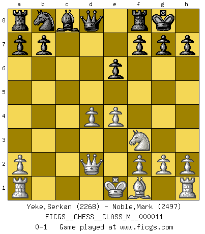 Last move : 0-1 2007 July 27 12:58:13 [Event "FICGS__CHESS__CLASS_M__000011"] [Site "FICGS"] [Date "2007.05.19"] [Round "1"] [White "Yeke,Serkan"] [Black "Noble,Mark"] [Result "0-1"] [WhiteElo "2268"] [BlackElo "2497"] 1.Nf3 c5 2.c4 Nf6 3.Nc3 d5 4.cxd5 Nxd5 5.d4 e6 6.e4 Nxc3 7.bxc3 cxd4 8.cxd4 Bb4+ 9.Bd2 Bxd2+ 10.Qxd2 O-O 0-1 Reti Opening Kingside Castling by player Black (move 10) Player Black won this chess game. Follow this game move after move (download)Fischer is under obligation to nobody. (Joseph Platz) Woher wissen wir, daß der Neanderthaler Blindschach gespielt hat? -- Bei Ausgrabungen wurden keine Schachbretter und Figuren gefunden. (Anonymous) Aquellos que dicen que entienden al Ajedrez, no entienden nada. (Robert Hubner) Mon pion favori sur ma case favorite ! Bronstein en parlant d'un coup de pion en h5 quand il avait les Noirs. Internet: Absolute communication, absolute isolation. (Paul Carvel)