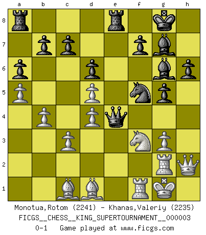 Last move : 0-1 2018 September 20 6:23:11 [Event "FICGS__CHESS__KING_SUPERTOURNAMENT__000003"] [Site "FICGS"] [Date "2018.09.16"] [Round "1"] [White "Monotua,Rotom"] [Black "Khanas,Valeriy"] [Result "0-1"] [WhiteElo "2241"] [BlackElo "2235"] 1.e4 e5 2.f4 exf4 3.Nf3 g5 4.Bc4 Bg7 5.d4 d6 6.O-O h6 7.Nc3 Nc6 8.Nd5 Nge7 9.c3 Nxd5 10.exd5 Ne7 11.g3 fxg3 12.hxg3 O-O 13.a4 Bg4 14.Qc2 Bf5 15.Qh2 Bg6 16.b4 Re8 17.Ra2 Qd7 18.a5 a6 19.Bb3 Qg4 20.Bd1 Nf5 21.Rg2 Qe4 0-1 King's knight's gambit Kingside Castling by player White (move 6) Kingside Castling by player Black (move 12) Player Black won this chess game. Follow this game move after move (download)Discovered check is the dive bomber of the Chessboard. (Reuben Fine) Aljechin war kein Nazi. Er war ein Opportunist. Ein schrecklicher Mann. Er liebte Geld über alles und würde für Geld ein Jude, ein Katolik oder ein Protestant werden. (Miguel Najdorf) El Ajedrez es 99 por ciento táctica. (Teichmann) Vous savez, camarade Pachman, je n'éprouve pas de plaisir à être ministre, je jouerais plutôt aux échecs comme vous, ou alors ferais une révolution au Venezuela. (Che Guevara à Ludek Pachman, 'Checkmate in Prague', 1975) We're missing something. (Gregory House, House M.D.)