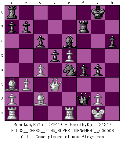 Last move : 0-1 2018 September 23 16:36:59 [Event "FICGS__CHESS__KING_SUPERTOURNAMENT__000003"] [Site "FICGS"] [Date "2018.09.16"] [Round "1"] [White "Monotua,Rotom"] [Black "Farnik,Kym"] [Result "0-1"] [WhiteElo "2241"] [BlackElo "2131"] 1.e4 e5 2.f4 exf4 3.Nf3 d6 4.Bc4 h6 5.d4 g5 6.O-O Nc6 7.Nc3 Bg7 8.Nd5 Nge7 9.Nxe7 Nxe7 10.c3 O-O 11.h3 c6 12.Bb3 d5 13.e5 Nf5 14.Bc2 Ng3 15.Re1 f5 16.b3 Ne4 17.Ba3 Rf7 18.Qd3 g4 19.e6 Bxe6 20.Ne5 Bxe5 21.dxe5 Qh4 22.hxg4 fxg4 23.c4 Qf2+ 0-1 KGA : Fischer defense Kingside Castling by player White (move 6) Kingside Castling by player Black (move 10) Player Black won this chess game. Follow this game move after move (download)Chess makes man wiser and clear-sighted. (Vladimir Putin) Es ist peinlich, dass ich nie Weltmeister wurde. Es wäre leicht, Leonid Breschnjew als Ursache vorzuschieben, dessen Apparat den Vorzeigekommunisten Anatoli Karpow in allem unterstützte. Aber Garri Kasparow zum Beispiel, der ebenfalls von den Sowjets unerwünscht war, hat trotz der Widerstände den WM-Titel erobert. (Viktor Kortschnoi) El Ajedrez es de 30 a 40 por ciento psicología. Uno no cuenta con esto cuando se juega contra una computadora. No lo puedo confundir. (Judith Polgar) La victoire dans une partie d'Echecs appartient la plupart du temps à celui qui voit un peu plus loin que l'adversaire. (Lasker) You lose, general Kenobi. (General Grievous in Star Wars ep.3)