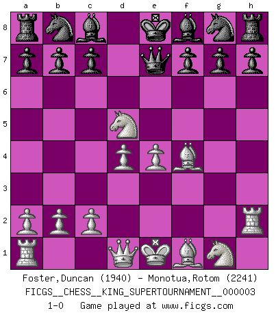 Last move : 1-0 2018 September 19 18:59:28 [Event "FICGS__CHESS__KING_SUPERTOURNAMENT__000003"] [Site "FICGS"] [Date "2018.09.16"] [Round "1"] [White "Foster,Duncan"] [Black "Monotua,Rotom"] [Result "1-0"] [WhiteElo "1940"] [BlackElo "2241"] 1.e4 e5 2.f4 Qh4+ 3.g3 Qe7 4.Nc3 exf4 5.d4 fxg3 6.Bf4 gxh2 7.Rxh2 d5 8.Nxd5 1-0 KGD : Keene's defense Player White won this chess game. Follow this game move after move (download)The chessboard is the world, the pieces are the phenomena of the Universe, the rules of the game are what we call the laws of Nature and the player on the other side is hidden from us. (Thomas Huxley) Der Umstand, daß uns eine 7 Stunden Zeitkontrolle ermöglicht eine großartige, tiefe Partie zu spielen, ist für die Massenmedien nicht weiter von Bedeutung. (Alexej Shirov) Después de la respuesta de las negras a 1.e4 con 1..e5, se quedan siempre tratando de entrar dentro del juego. (Howard Staunton) Vous n'êtes pas toujours obligé de jouer le meilleur coup. Un coup doit être actif, entreprenant, correct et beau ! (David Bronstein) Creativity is allowing yourself to make mistakes. Art is knowing which ones to keep. (Scott Adams)