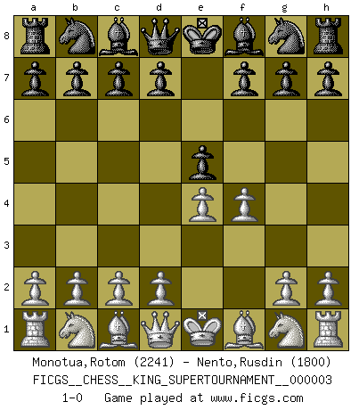 Last move : 1-0 2018 October 16 8:55:46 [Event "FICGS__CHESS__KING_SUPERTOURNAMENT__000003"] [Site "FICGS"] [Date "2018.09.16"] [Round "1"] [White "Monotua,Rotom"] [Black "Nento,Rusdin"] [Result "1-0"] [WhiteElo "2241"] [BlackElo "1800"] 1.e4 e5 2.f4 1-0 This chess game has been lost on time (started : 2018.09.16 2:52:46) King's gambit Player White won this chess game. Follow this game move after move (download)Many have become Chess Masters, no one has become the Master of Chess. (Siegbert Tarrasch) Ohne Leiden bildet sich kein Charakter. (Ernst Freiherr von Feuchtersleben) La batalla por la última verdad nunca sera ganada. Y es por eso que el Ajedrez es tan fascinante. (Hans Kmoch) Des points faibles ou des trous dans la position de l'adversaire doivent être occupés par des pièces et non pas par des pions. (Siegbert Tarrasch) Cactus - It is depressed cucumber. (Ilmars Cirulis)