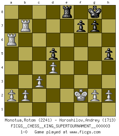 Last move : 1-0 2018 October 16 8:35:4 [Event "FICGS__CHESS__KING_SUPERTOURNAMENT__000003"] [Site "FICGS"] [Date "2018.09.16"] [Round "1"] [White "Monotua,Rotom"] [Black "Horoshilov,Andrey"] [Result "1-0"] [WhiteElo "2241"] [BlackElo "1713"] 1.e4 e5 2.f4 d5 3.exd5 Qxd5 4.fxe5 Qxe5+ 5.Qe2 Qxe2+ 6.Bxe2 Nf6 7.Nf3 Bd6 8.Nc3 O-O 9.O-O Bg4 10.d4 a6 11.Ne5 Bxe2 12.Nxe2 Nbd7 13.Nxd7 Nxd7 14.Bf4 Rfe8 15.Rae1 h6 16.Bxd6 cxd6 17.Nf4 Rac8 18.c3 Kf8 19.Ng6+ Kg8 20.Ne7+ Rxe7 21.Rxe7 Nf6 22.Rxb7 h5 23.Rxf6 d5 24.Rxa6 Re8 25.Kf2 1-0 KGD : Falkbeer counter-gambit Kingside Castling by player Black (move 8) Kingside Castling by player White (move 9) Player White won this chess game. Follow this game move after move (download)Checkers is for tramps. (Paul Morphy) Weshalb minderdergeübte Spieler mit g2-g4 beginnen? Die betreffenden sind unschlüssig, ob sie nun rechts (h4) oder links (f4) beginnen sollen, und in ihrer Ratlosigkeit entschliessen sie sich nach guter Bürgerart dazu, den goldenen Mittelweg zu wählen. (Aaron Nimzowitsch) Yo he agregado estos principios a la ley: pongan los Caballos en acción antes de que los dos Alfiles sean desarrollados. (Emanuel Lasker) L'ordinateur a tué l'originalité. Il n'y a plus guère d'aventures sur l'échiquier. (Jacob Murray) Excelling at chess has long been considered a symbol of more general intelligence. That is an incorrect assumption in my view, as pleasant as it might be. But for the purposes of argument and investigation, chess is, in Russkin-Gutman's words, 'an unparalleled laboratory, since both the learning process and the degree of ability obtained can be objectified and quantified, providing an excellent comparative framework on which to use rigorous analytical techniques.' (The Chess Master and the Computer, by Garry Kasparov - 2010)