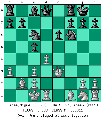 Last move : 0-1 2007 November 3 6:19:53 [Event "FICGS__CHESS__CLASS_M__000011"] [Site "FICGS"] [Date "2007.05.19"] [Round "1"] [White "Pires,Miguel"] [Black "De Silva,Dinesh"] [Result "0-1"] [WhiteElo "2270"] [BlackElo "2235"] 1.e4 e6 2.d4 d5 3.Nc3 Bb4 4.a3 Bxc3+ 5.bxc3 dxe4 6.f3 c5 7.Qd2 Nf6 8.Bb2 Nc6 9.O-O-O O-O 10.fxe4 Nxe4 11.Qe3 Nf6 0-1 This chess game has been lost on time (started : 2007.05.19 1:20:45) French : Winawer (Nimzovich) variation Queenside Castling by player White (move 9) Kingside Castling by player Black (move 9) Player Black won this chess game. Follow this game move after move (download)Chess holds its master in its own bonds, shackling the mind and brain so that the inner freedom of the very strongest must suffer. (Albert Einstein) Die unerbitterlichsten Regeln im Schach sind die Ausnahmen. (Savielly Grigorievitsch Tartakower) Las piezas de Ajedrez son los bloques del alfabeto que moldean los pensamientos; y esos pensamientos, aunque hagan un diseño visual en el tablero, expresan abstractamente su belleza como un poema. (Marcel Duchamp) Les pièces de l'échiquier étaient impitoyables. Elles le retenaient, elles l'absorbaient. Il y avait de l'horreur en cela, mais aussi une harmonie unique. Car, qu'y a-t-il dans le monde, à part les échecs ? (V. Nabokov) Thus, what is of supreme importance in war is to attack the enemy's strategy. (Sun Tzu)