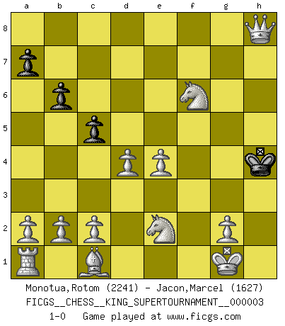 Last move : 1-0 2018 September 23 9:29:57 [Event "FICGS__CHESS__KING_SUPERTOURNAMENT__000003"] [Site "FICGS"] [Date "2018.09.16"] [Round "1"] [White "Monotua,Rotom"] [Black "Jacon,Marcel"] [Result "1-0"] [WhiteElo "2241"] [BlackElo "1627"] 1.e4 e5 2.f4 f6 3.fxe5 fxe5 4.Qh5+ g6 5.Qxe5+ Ne7 6.Qxh8 g5 7.Be2 Kf7 8.Bh5+ Ng6 9.Qxh7+ Bg7 10.Qxg6+ Kg8 11.Nf3 Qf6 12.Qe8+ Qf8 13.Nxg5 Qxe8 14.Bxe8 d6 15.Bf7+ Kf8 16.Be6 Bxe6 17.Nxe6+ Ke7 18.Nxg7 Nd7 19.h4 Rg8 20.Nf5+ Kf6 21.O-O Ke5 22.Nc3 d5 23.d4+ Ke6 24.Nxd5 c6 25.Nf4+ Kf6 26.h5 Kg5 27.Rf3 Nf6 28.Rg3+ Ng4 29.Rxg4+ Kxg4 30.Nh6+ Kg5 31.Nxg8 Kh4 32.h6 Kg3 33.Nf6 Kh4 34.Ne2 b6 35.h7 c5 36.h8Q+ 1-0 King's gambit Kingside Castling by player White (move 21) Promotion Queen by player White (move 36) Player White won this chess game. Follow this game move after move (download)One of these modest little moves may be more embarrassing to your opponent than the biggest threat. (Siegbert Tarrasch) Ein guter Spieler hat immer Glück. (José Raúl Capablanca) El Ajedrez es la vida. (Bobby Fischer) Je crois qu'il existe des manières très spécifiques de jouer efficacement contre une machine. Evidemment, nous n'avons aucune chance en technique pure, parce que l'ordinateur calcule de manière parfaite. Mais lorsque nous faisons appel à notre cerveau, en utilisant l'intuition et la compréhension, alors nous restons beaucoup plus forts. (Anatoli Karpov) History is the quarrels of popes and kings, with wars or pestilences in every page; the men all so good for nothing, and hardly any women at all. (Jane Austen)
