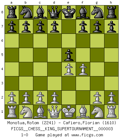 Last move : 1-0 2018 November 7 11:47:6 [Event "FICGS__CHESS__KING_SUPERTOURNAMENT__000003"] [Site "FICGS"] [Date "2018.09.16"] [Round "1"] [White "Monotua,Rotom"] [Black "Cafiero,Florian"] [Result "1-0"] [WhiteElo "2241"] [BlackElo "1610"] 1.e4 e5 2.f4 1-0 King's gambit Player White won this chess game. Follow this game move after move (download)Though most people love to look at the games of the great attacking masters, some of the most successful players in history have been the quiet positional players. They slowly grind you down by taking away your space, tying up your pieces, and leaving you with virtually nothing to do ! (Yasser Seirawan) Ein Buch ist ein Spiegel; wenn ein Affe hineinsieht, so kann kein Apostel heraus gucken. (Georg Christoph Lichtenberg) La captura del Rey enemigo es la finalidad pero no el primer objetivo de la partida. (William Steinitz) Comme les marins qui ont mille raisons différentes d'aller en mer, les joueurs d'échecs en ont tout autant avant de s'installer devant une table et jouer... (Vincent Bertignac, philosophe) The difference between perseverance and obstinacy is that one comes from a strong will, and the other from a strong won't. (Henry Ward Beecher)