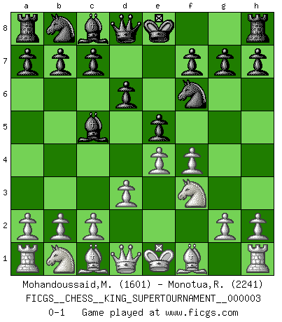 Last move : 0-1 2018 October 18 9:22:23 [Event "FICGS__CHESS__KING_SUPERTOURNAMENT__000003"] [Site "FICGS"] [Date "2018.09.16"] [Round "1"] [White "Mohandoussaid,Malik"] [Black "Monotua,Rotom"] [Result "0-1"] [WhiteElo "1601"] [BlackElo "2241"] 1.e4 e5 2.f4 Bc5 3.Nf3 Nf6 4.d3 d6 0-1 This chess game has been lost on time (started : 2018.09.16 2:52:46) KGD : Classical variation Player Black won this chess game. Follow this game move after move (download)It's always better to sacrifice your opponent's men. (Savielly Tartakover) Versuche, dich von der Sklaverei der Eröffnungsvarianten zu befreien. Stattdessen soll man gewisse Typenpositionen erlernen, die man eingehend analysiert. (Aaron Nimzowitsch) a manera como él juega al Ajedrez, demuestra la completa naturaleza de un hombre. (Stanley Ellin) Horreur, mais aussi harmonie suprême : qu'y avait-il en effet au monde en dehors des échecs ? Le brouillard, l'inconnu, le non-être... (Vladimir Nabokov) The arrogant army will lose certainly the battle. (Chinese proverb)