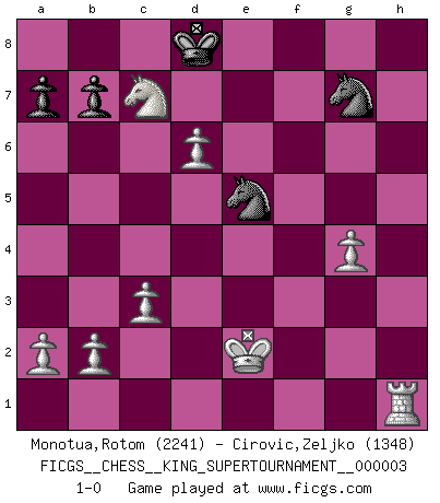 Last move : 1-0 2018 September 29 11:26:49 [Event "FICGS__CHESS__KING_SUPERTOURNAMENT__000003"] [Site "FICGS"] [Date "2018.09.16"] [Round "1"] [White "Monotua,Rotom"] [Black "Cirovic,Zeljko"] [Result "1-0"] [WhiteElo "2241"] [BlackElo "1348"] 1.e4 e5 2.f4 exf4 3.Nc3 Qh4+ 4.Ke2 d6 5.d4 Bg4+ 6.Nf3 f5 7.Bxf4 Bxf3+ 8.Kxf3 g5 9.Bg3 Qh5+ 10.Kf2 Qxd1 11.Rxd1 f4 12.Bxf4 gxf4 13.Nd5 Kd7 14.Nxf4 Nf6 15.Bd3 Nc6 16.c3 Bh6 17.g3 Rhe8 18.Rhe1 Ng4+ 19.Ke2 Nxh2 20.Nd5 Bg5 21.Rh1 Ng4 22.Rxh7+ Be7 23.e5 dxe5 24.Bf5+ Kd8 25.dxe5 Bd6 26.Rd7+ Kc8 27.Re7 Kd8 28.Rxe8+ Kxe8 29.exd6 Nh6 30.Nxc7+ Kd8 31.Nxa8 Nxf5 32.g4 Ng7 33.Nc7 Ne5 34.Rh1 1-0 KGA : Keres (Mason-Steinitz) gambit Player White won this chess game. Follow this game move after move (download)Not all artists are Chess players, but all Chess players are artists. (Marcel Duchamp) Das Spiel gibt uns die Genugtuung, die das Leben uns versagt. (Emanuel Lasker) Muchos jugadores de Ajedrez se sorprendían cuando después de la partida, Fischer explicaba con calma: 'Yo ya había analizado esta posibilidad' en una posición en la cual yo creía que no era posible de prever desde la apertura. (Mikhail Tal) Aidez vos pièces, elles vous aideront. (Paul Morphy) It's not a bug - it's an undocumented feature. (Anonymous)