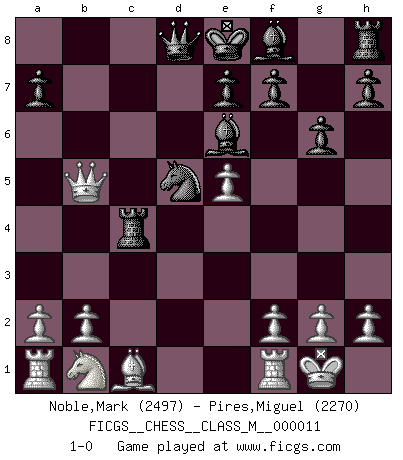 Last move : 1-0 2007 September 7 13:24:4 [Event "FICGS__CHESS__CLASS_M__000011"] [Site "FICGS"] [Date "2007.05.19"] [Round "1"] [White "Noble,Mark"] [Black "Pires,Miguel"] [Result "1-0"] [WhiteElo "2497"] [BlackElo "2270"] 1.e4 c5 2.d4 cxd4 3.c3 Nf6 4.e5 Nd5 5.Nf3 Nc6 6.cxd4 d6 7.Bc4 Be6 8.O-O g6 9.Qb3 dxe5 10.Qxb7 Rc8 11.Nxe5 Nxe5 12.dxe5 Rxc4 13.Qb5+ 1-0 This chess game has been lost on time (started : 2007.05.19 1:20:45) Sicilian : Smith-Morra gambit Kingside Castling by player White (move 8) Player White won this chess game. Follow this game move after move (download)The passion for playing Chess is one of the most unaccountable in the world. (H.G. Wells) Mein erstes Ziel war nicht, die Partie zu gewinnen, sondern eine Figur zu opfern. -- der junge (Wilhelm Steinitz) Fischer era un maestro de claridad y un Rey del posicionamiento astuto. Sus oponentes podían ver hacia donde se dirigía pero eran impotentes para detenerlo. (Bruce Pandolfini) La conception d'un plan est le processus par lequel un joueur exploite les avantages de sa position tout en s'efforçant d'en réduire au minimum les inconvénients. Afin de garantir le succès, un plan doit toujours se fonder sur un diagnostic objectif des particularités d'une position. La conception d'un plan est d'autant plus difficile que la position est équilibrée, et grandement facilitée lorsqu'il n'existe qu'un seul plan susceptible de répondre aux exigences de la position. (Harry Golombek) There is a computer disease that anybody who works with computers knows about. It's a very serious disease and it interferes completely with the work. The trouble with computers is that you 'play' with them ! (Richard P. Feynman)