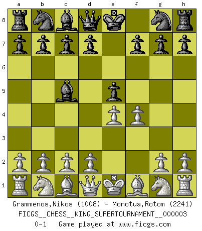 Last move : 0-1 2018 October 16 8:55:46 [Event "FICGS__CHESS__KING_SUPERTOURNAMENT__000003"] [Site "FICGS"] [Date "2018.09.16"] [Round "1"] [White "Grammenos,Nikos"] [Black "Monotua,Rotom"] [Result "0-1"] [WhiteElo "1008"] [BlackElo "2241"] 1.e4 e5 2.f4 Bc5 0-1 This chess game has been lost on time (started : 2018.09.16 2:52:46) KGD : Classical variation Player Black won this chess game. Follow this game move after move (download)Chess is ruthless: you've got to be prepared to kill people. (Nigel Short) Jeder leidlich begabte Spieler, er braucht keineswegs hervorragend veranlagt zu sein, kann es zum Meister bringen. Aber das ist ja auch gar nicht nötig! Der richtige Standpunkt ist es, zu seinem Vergnügen zu spielen, und man glaube ja nicht, dass der Genuss proportional dem Können sei. (Siegbert Tarrasch) El Ajedrez era la lengua materna de Capablanca. (Reti) Il s'avisa de me proposer d'apprendre les échecs qu'il jouait un peu... me voilà forcené des échecs. J'achète un échiquier, je m'enferme dans ma chambre, j'y passe des jours et des nuits à vouloir apprendre par cur toutes les parties. (Jean-Jacques Rousseau, Confessions) Follow your passion, and success will follow you. (Arthur Buddhold)