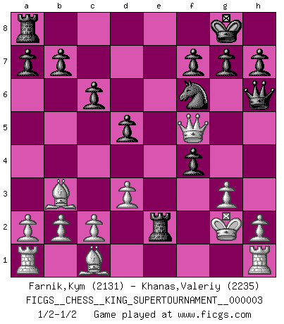 Last move : 1/2-1/2 2018 September 20 8:27:32 [Event "FICGS__CHESS__KING_SUPERTOURNAMENT__000003"] [Site "FICGS"] [Date "2018.09.16"] [Round "1"] [White "Farnik,Kym"] [Black "Khanas,Valeriy"] [Result "1/2-1/2"] [WhiteElo "2131"] [BlackElo "2235"] 1.e4 e5 2.f4 exf4 3.Bc4 Qh4+ 4.Kf1 d6 5.Nf3 Qh6 6.Nc3 Be6 7.Nd5 Bxd5 8.Bxd5 c6 9.Bb3 Nf6 10.d3 Nbd7 11.Kg1 d5 12.g3 Bd6 13.e5 Nxe5 14.Nxe5 Bxe5 15.Qe1 O-O 16.Qxe5 Rfe8 17.Qf5 Re1+ 18.Kg2 Re2+ 1/2-1/2 KGA : Bishop's gambit Kingside Castling by player Black (move 15) This chess game ended in a draw. Follow this game move after move (download)That's what Chess is all about. One day you give your opponent a lesson, the next day he gives you one. (Bobby Fischer) Die Auseinandersetzung mit Karpow war politisch geprägt. Er stand für das kommunistische System, wurde von dessen Repräsentanten gehätschelt. Ich war der Oppositionelle. Jeder Schachweltmeister spiegelt auch die gesellschaftlichen Verhältnisse wider. Kramnik steht für die Börsen-Generation des Neuen Markts, ideologiefrei, zahlenfixiert. (Garry Kasparov) En el Ajedrez, cuando menos, el valiente hereda la tierra. (Edmar Mednis) Il a essayé de se convaincre qu'il pourrait empêcher toutes les erreurs et ne jamais perdre. L'horreur ! Gary Kasparov au sujet de Robert Fischer. In theory there is no difference between theory and practice. In practice there is. (Yogi Berra)