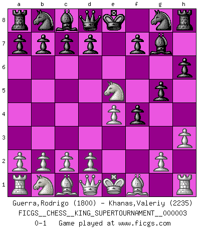 Last move : 0-1 2018 October 19 21:30:50 [Event "FICGS__CHESS__KING_SUPERTOURNAMENT__000003"] [Site "FICGS"] [Date "2018.09.16"] [Round "1"] [White "Guerra,Rodrigo"] [Black "Khanas,Valeriy"] [Result "0-1"] [WhiteElo "1800"] [BlackElo "2235"] 1.e4 e5 2.f4 exf4 3.Nf3 g5 4.h3 h6 5.Ne5 Bg7 0-1 This chess game has been lost on time (started : 2018.09.16 2:52:46) King's knight's gambit Player Black won this chess game. Follow this game move after move (download)A great player and a great example for many. His book My 60 Memorable Games had a big impact on me. It is a shame he didn't continue to enrich the world of chess with his unparalleled understanding after 1972. (Jan Timman, about Bobby Fischer's death) Warum muß ich gegen diesen IDIOTEN verlieren? (Aaron Nimzowitsch) La vida es como el Ajedrez, con lucha, competición y eventos buenos y malos. (Benjamin Franklin) Les échecs, c'est l'imagination. (David Bronstein) After growing wildly for years, the field of computing appears to be reaching its infancy. (John Pierce)