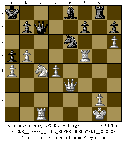 Last move : 1-0 2018 October 21 22:14:14 [Event "FICGS__CHESS__KING_SUPERTOURNAMENT__000003"] [Site "FICGS"] [Date "2018.09.16"] [Round "1"] [White "Khanas,Valeriy"] [Black "Trigance,Emile"] [Result "1-0"] [WhiteElo "2235"] [BlackElo "1786"] 1.e4 e5 2.f4 d5 3.exd5 c6 4.Qe2 cxd5 5.fxe5 Nc6 6.Nf3 Nge7 7.d4 Bg4 8.c3 Ng6 9.h3 Bd7 10.Qe3 Be7 11.Bd3 Qb6 12.h4 O-O-O 13.a4 Kb8 14.h5 Nf8 15.b4 a5 16.b5 Na7 17.Ng5 Bxg5 18.Qxg5 Ne6 19.Qe3 g6 20.O-O Be8 21.h6 Nc8 22.Nd2 Ne7 23.Ba3 Nf5 24.Bxf5 gxf5 25.Bd6+ Ka8 26.Rxf5 Rg8 27.Raf1 Rxd6 28.exd6 Qxd6 29.c4 dxc4 30.Nxc4 Qc7 31.Rc1 1-0 KGD : Nimzovich counter-gambit Queenside Castling by player Black (move 12) Kingside Castling by player White (move 20) Player White won this chess game. Follow this game move after move (download)By the beauty of his games, the clarity of his play, and the brilliance of his ideas, Fischer made himself an artist of the same stature as Brahms, Rembrandt, and Shakespeare. (David Levy) Ohne Leiden bildet sich kein Charakter. (Ernst Freiherr von Feuchtersleben) La batalla por la última verdad nunca sera ganada. Y es por eso que el Ajedrez es tan fascinante. (Hans Kmoch) En blitz, le Cavalier l'emporte sur le Fou. (Vlastimil Hort) A clear conscience is usually the sign of a bad memory. (Unknown)