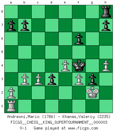 Last move : 0-1 2018 September 28 18:11:41 [Event "FICGS__CHESS__KING_SUPERTOURNAMENT__000003"] [Site "FICGS"] [Date "2018.09.16"] [Round "1"] [White "Andreoni,Mario"] [Black "Khanas,Valeriy"] [Result "0-1"] [WhiteElo "1786"] [BlackElo "2235"] 1.e4 e5 2.f4 exf4 3.Nf3 g5 4.Bc4 Bg7 5.h4 g4 6.Ng5 Nh6 7.d4 d5 8.Bxd5 c6 9.Bb3 Qxd4 10.Qxd4 Bxd4 11.c3 Be5 12.O-O f6 13.Ne6 Bxe6 14.Bxe6 Ke7 15.Bb3 Nd7 16.Bxf4 Bxf4 17.Rxf4 Rad8 18.Na3 Ne5 19.Rf2 g3 20.Re2 Nhg4 21.Nc2 c5 22.Ne3 Nxe3 23.Rxe3 c4 24.Bd1 Rd3 25.Rxd3 cxd3 26.b3 Ke6 27.Bf3 Nxf3+ 28.gxf3 Ke5 29.Kg2 Kf4 0-1 KGA : Philidor gambit Kingside Castling by player White (move 12) Player Black won this chess game. Follow this game move after move (download)It is difficult to play against Einstein's theory --on his first loss to Fischer. (Mikhail Tal) Garry Kasparov war erst in der Großmeister-Organisation GMA, dann in der Profischach-Vereinigung PCA, zum Schluss kehrte er wieder in den Schoß der FIDE zurück. Aber gut, manche Leute sind flexibel (Viswanathan Anand) Repentinamente, me resultaba obvio en mi analisis que yo había pasado por alto lo que Fischer había visto en el tablero con la mas grande facilidad. (Mikhail Botvinnik) Soyez une menace à chaque fois que vous vous asseyez pour jouer. (Ken Smith) Life is verb, not a noun. (Charlotte Perkins Gilman)