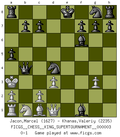 Last move : 0-1 2018 September 20 17:26:56 [Event "FICGS__CHESS__KING_SUPERTOURNAMENT__000003"] [Site "FICGS"] [Date "2018.09.16"] [Round "1"] [White "Jacon,Marcel"] [Black "Khanas,Valeriy"] [Result "0-1"] [WhiteElo "1627"] [BlackElo "2235"] 1.e4 e5 2.f4 exf4 3.Nh3 Qh4+ 4.g3 fxg3 5.hxg3 Qxe4+ 6.Be2 Qxh1+ 7.Bf1 d5 8.Qe2+ Be7 9.d3 Bxh3 10.Kd2 Bxf1 11.Qd1 Bg5+ 12.Kc3 d4+ 13.Kxd4 Nc6+ 14.Kc3 Bf6+ 15.Kb3 Nd4+ 16.Kc4 Qc6+ 17.Kb4 a5+ 18.Ka3 Qc5+ 19.b4 Qxb4+ 0-1 King's gambit accepted Player Black won this chess game. Follow this game move after move (download)The passed Pawn is a criminal, who should be kept under lock and key. Mild measures, such as police surveillance, are not sufficient. (Aaron Nimzovich) Ein Isolani verdüstert die Stimmung auf dem ganzen Schachbrett. (Savielly Grigorievitsch Tartakower) Una clavada es mas poderosa que una espada. (Fred Reinfeld) Tout change constamment, y compris dans le monde des Echecs. (Botvinnik) Better than a thousand days of diligent study is one day with a great teacher. (Japanese proverb)