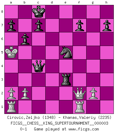 Last move : 0-1 2018 September 30 8:51:42 [Event "FICGS__CHESS__KING_SUPERTOURNAMENT__000003"] [Site "FICGS"] [Date "2018.09.16"] [Round "1"] [White "Cirovic,Zeljko"] [Black "Khanas,Valeriy"] [Result "0-1"] [WhiteElo "1348"] [BlackElo "2235"] 1.e4 e5 2.f4 exf4 3.Nf3 d6 4.d4 g5 5.h4 g4 6.Bxf4 gxf3 7.Qxf3 Nf6 8.Bg5 Be7 9.e5 dxe5 10.dxe5 Bg4 11.Qd3 Nbd7 12.exf6 Bxf6 13.Bxf6 Qxf6 14.Qe4+ Ne5 15.Bd3 O-O-O 16.Rf1 Qxh4+ 17.Kd2 Rhe8 18.Qf4 Ng6 19.Qf2 Qg5+ 20.Kc3 Re3 21.Nd2 Qe5+ 22.Kb3 Qb5+ 23.Ka3 Qa5+ 24.Kb3 Be6+ 25.Nc4 Bxc4+ 26.Kxc4 Ne5+ 27.Kb3 Qb5+ 28.Kc3 R8xd3+ 29.cxd3 Qxd3+ 30.Kb4 Qc4+ 31.Ka5 b6+ 0-1 KGA : Fischer defense Queenside Castling by player Black (move 15) Player Black won this chess game. Follow this game move after move (download)The Pin is mightier than the sword. (Fred Reinfeld) Ich tröste mich mit dem Vergnügen, daß Schachfans, Zuschauer und Leser glücklich sind, wenn ein Großmeister etwas riskiert, statt nur Klötzchen zu schieben. (Mikhail Nekhemyevich Tal) Un jugador que trata de regresar una movida en el Ajedrez es un futuro carterista. (Richard Fenton) Il n'y a pas de prix trop élevé au scalp de l'ennemi. (Koblentz) All art requires courage. (Anne Tucker)
