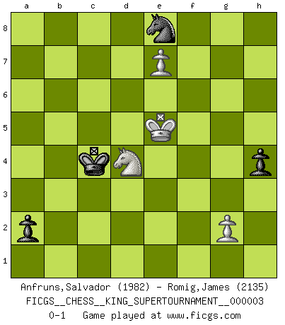 Last move : 0-1 2018 September 23 20:30:40 [Event "FICGS__CHESS__KING_SUPERTOURNAMENT__000003"] [Site "FICGS"] [Date "2018.09.16"] [Round "1"] [White "Anfruns,Salvador"] [Black "Romig,James"] [Result "0-1"] [WhiteElo "1982"] [BlackElo "2135"] 1.e4 e5 2.f4 exf4 3.Nf3 g5 4.Nc3 g4 5.Ne5 Nc6 6.Nxg4 Qh4+ 7.Nf2 Bc5 8.d4 Bxd4 9.Qf3 d6 10.Bxf4 Ne5 11.Bxe5 dxe5 12.Nd5 Bg4 13.Qg3 Qxg3 14.hxg3 Bxf2+ 15.Kxf2 O-O-O 16.Bd3 h5 17.Be2 Bxe2 18.Kxe2 c6 19.Nc3 Kd7 20.Rad1+ Ke7 21.Rxd8 Kxd8 22.g4 Nf6 23.g5 Nd7 24.Rf1 Ke7 25.Nd1 Rg8 26.Rf5 Nc5 27.Rxe5+ Ne6 28.c3 Rxg5 29.Rxg5 Nxg5 30.Ke3 Ne6 31.b4 b5 32.Nb2 c5 33.e5 Kd7 34.Nd3 Kc6 35.Ke4 h4 36.a3 a6 37.Nc1 Nf8 38.Nb3 Nd7 39.Na5+ Kc7 40.c4 Kb6 41.Kd5 cxb4 42.axb4 bxc4 43.Nxc4+ Kb5 44.Nd6+ Kxb4 45.Nxf7 a5 46.e6 Nf6+ 47.Ke5 Ne8 48.Nd6 Nc7 49.Nf5 a4 50.Nd4 Kc4 51.e7 a3 52.Ne6 Ne8 53.Nd4 a2 0-1 KGA : Quaade gambit Queenside Castling by player Black (move 15) 10 pieces endgame at move 43 : White KNPPP , Black KNPPP WHITE : King + 1 Knight 3 Pawns BLACK : King + 1 Knight 3 Pawns 9 pieces endgame at move 44 : White KNPP , Black KNPPP WHITE : King + 1 Knight 2 Pawns BLACK : King + 1 Knight 3 Pawns 8 pieces endgame at move 45 : White KNPP , Black KNPP WHITE : King + 1 Knight 2 Pawns BLACK : King + 1 Knight 2 Pawns Player Black won this chess game. Follow this game move after move (download)I guess a certain amount of temperament is expected of Chess geniuses. (Ron Gross) Im Reiche der Wirklichkeit ist man nie so glücklich wie im Reiche der Gedanken. (Arthur Schopenhauer) Por tratar de evitar la pérdida de una pieza, muchas personas han perdido una partida de Ajedrez. (Savielly Tartakover) La vérité est comme le meilleur coup aux échecs : elle existe, mais il faut la chercher. (Arturo Perez-Reverte) When you've done things right people won't know you've done anything at all. (Futurama)