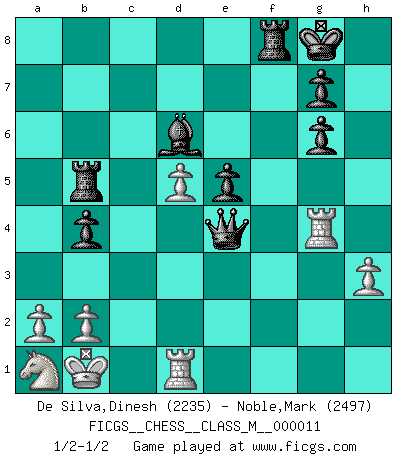 Last move : 1/2-1/2 2007 September 14 5:27:14 [Event "FICGS__CHESS__CLASS_M__000011"] [Site "FICGS"] [Date "2007.05.19"] [Round "1"] [White "De Silva,Dinesh"] [Black "Noble,Mark"] [Result "1/2-1/2"] [WhiteElo "2235"] [BlackElo "2497"] 1.e4 c5 2.Nf3 d6 3.d4 cxd4 4.Nxd4 Nf6 5.Nc3 a6 6.Be3 e5 7.Nb3 Be6 8.Qd2 Be7 9.f3 O-O 10.O-O-O Nbd7 11.g4 b5 12.g5 b4 13.Ne2 Ne8 14.f4 a5 15.f5 a4 16.fxe6 axb3 17.exf7+ Rxf7 18.Kb1 bxc2+ 19.Kxc2 Nb6 20.Nc1 d5 21.exd5 Nd6 22.Kb1 Nbc4 23.Bxc4 Nxc4 24.Qe2 Nxe3 25.g6 hxg6 26.Qxe3 Bd6 27.Rhg1 Qf6 28.Rg4 Qf5+ 29.Qe4 Ra5 30.Nb3 Rb5 31.h3 Rf8 32.Na1 Qxe4+ 1/2-1/2 Sicilian : Najdorf, Byrne (English) attack Kingside Castling by player Black (move 9) Queenside Castling by player White (move 10) This chess game ended in a draw. Follow this game move after move (download)Best by test: 1. e4 (Bobby Fischer) Oft bringt ein stiller Zug das Erdbeben. (Richard Reti) El Jaque al descubierto es el bombardero del tablero. (Reuben Fine) Les Echecs sont et restent toujours un combat, un combat intégral comme la boxe, la lutte ou un autre sport, et où il doit y avoir un vainqueur et un vaincu. (Joseph Emil Diemer) 'preceded by its own quotation yields a falsehood' preceded by its own quotation yields a falsehood. (W. V. O. Quine - Set Theory And Its Logic, 1953)
