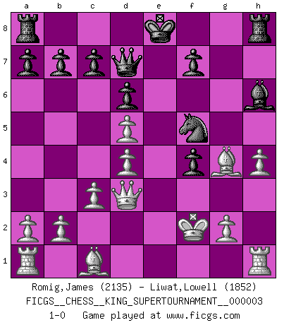 Last move : 1-0 2018 September 18 12:18:47 [Event "FICGS__CHESS__KING_SUPERTOURNAMENT__000003"] [Site "FICGS"] [Date "2018.09.16"] [Round "1"] [White "Romig,James"] [Black "Liwat,Lowell"] [Result "1-0"] [WhiteElo "2135"] [BlackElo "1852"] 1.e4 e5 2.f4 exf4 3.Nf3 g5 4.h4 g4 5.Ne5 d6 6.Nxg4 h5 7.Nf2 Nf6 8.d4 Bh6 9.Nc3 Nc6 10.Qd3 Ng4 11.Nd5 Nxf2 12.Kxf2 Be6 13.Be2 Bxd5 14.exd5 Ne7 15.Bxh5 Qd7 16.c3 Nf5 17.Bg4 1-0 KGA : Kieseritsky, Kolisch defense Player White won this chess game. Follow this game move after move (download)You sit at the board and suddenly your heart leaps. Your hand trembles to pick up the piece and move it. But what Chess teaches you is that you must sit there calmly and think about whether it's really a good idea and whether there are other better ideas. (Stanley Kubrick) Der Traum, für den ich lebe, ist der von einem freien Russland. Viele mögen sagen: Russland hat doch ein Parlament, einen gewählten Präsidenten. Aber ich spüre, dass in meiner Heimat die Angst wiederkehrt. Eine Angst, sich frei zu äußern, bestimmte Dinge zu tun (Garry Kasparov) El jugador táctico debe saber que hacer cuando algo se debe de hacer. El estratégico debe saber que hacer cuando nada se debe de hacer. (Savielly Tartakover) Soyez une menace à chaque fois que vous vous asseyez pour jouer. (Ken Smith) Life is like a ten-speed bicycle: most of us have gears we never use. (Charles M. Schulz)