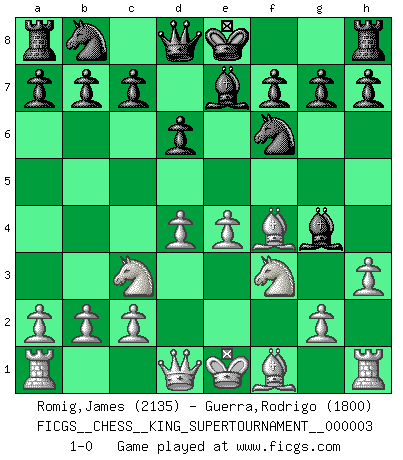 Last move : 1-0 2018 October 21 9:44:40 [Event "FICGS__CHESS__KING_SUPERTOURNAMENT__000003"] [Site "FICGS"] [Date "2018.09.16"] [Round "1"] [White "Romig,James"] [Black "Guerra,Rodrigo"] [Result "1-0"] [WhiteElo "2135"] [BlackElo "1800"] 1.e4 e5 2.f4 d6 3.Nf3 exf4 4.d4 Nf6 5.Nc3 Bg4 6.Bxf4 Be7 7.h3 1-0 This chess game has been lost on time (started : 2018.09.16 2:52:46) King's gambit Player White won this chess game. Follow this game move after move (download)I guess a certain amount of temperament is expected of Chess geniuses. (Ron Gross) Verschiedene, sehr schätzbare und im Laufe des Lebens nützliche Eigenschaften des Geistes können durch das Schachspiel erworben und gekräftigt werden, so dass sie zu Gewohnheiten werden, die uns nie im Stich lassen. (Benjamin Franklin) Cuando tu no sabes absolutamente que mas hacer, es tiempo de entrar en pánico. (John van der Wiel) J'apprécie les joueurs d'est-indienne, c'est grâce à eux que je nourris ma famille depuis tant d'années. (Petrosian) Fortune favours the audacious. (Desiderius Erasmus)