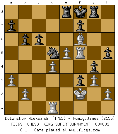 Last move : 0-1 2018 November 9 22:17:10 [Event "FICGS__CHESS__KING_SUPERTOURNAMENT__000003"] [Site "FICGS"] [Date "2018.09.16"] [Round "1"] [White "Dolzhikov,Aleksandr"] [Black "Romig,James"] [Result "0-1"] [WhiteElo "1762"] [BlackElo "2135"] 1.e4 e5 2.f4 exf4 3.Nf3 g5 4.Nc3 Bg7 5.g3 d5 6.d4 dxe4 7.Nxe4 g4 8.Ne5 Bxe5 9.dxe5 Qxd1+ 10.Kxd1 f3 11.Bf4 Nc6 12.Ke1 Bf5 13.Bd3 h5 14.Kf2 Ke7 15.Rad1 Nb4 16.Rhe1 b6 17.Bg5+ Kf8 18.a3 Nxd3+ 19.cxd3 c6 20.d4 Bxe4 21.Rxe4 Ne7 22.Bf6 Rg8 23.Rf4 Nd5 24.Rf5 Re8 0-1 This chess game has been lost on time (started : 2018.09.16 2:52:46) KGA : Quaade gambit Player Black won this chess game. Follow this game move after move (download)A thorough understanding of the typical mating continuations makes the most complicated sacrificial combinations leading up to them not only not difficult, but almost a matter of course. (Siegbert Tarrasch) Bogoljubow: Matt in vier Zügen! Tartakower: Ich verbitte mir jede Belästigung! (Savielly Grigorievitsch Tartakower) En partidas rápidas, el Caballo es mas poderoso que el Alfil. (Vlastimil Hort) Votre seul travail dans les ouvertures est d'obtenir un milieu de partie jouable. (Lajos Portish) The mind is like a parachute, it only functions when its open. (Unknown)