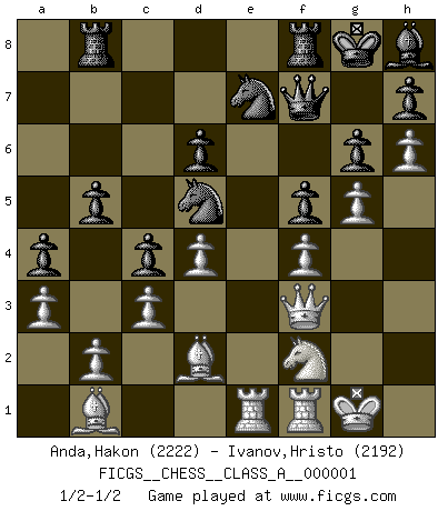 Last move : 1/2-1/2 2006 June 19 15:29:16 [Event "FICGS__CHESS__CLASS_A__000001"] [Site "FICGS"] [Date "2006.04.08"] [Round "1"] [White "Anda,Hakon"] [Black "Ivanov,Hristo"] [Result "1/2-1/2"] [WhiteElo "2222"] [BlackElo "2192"] 1.Nc3 c5 2.f4 Nc6 3.Nf3 g6 4.e4 Bg7 5.a3 d6 6.Bc4 Nf6 7.d3 Bg4 8.h3 Bxf3 9.Qxf3 O-O 10.Be3 Rb8 11.O-O Nd7 12.Nd1 b5 13.Ba2 e6 14.c3 a5 15.Nf2 a4 16.Rad1 Ne7 17.d4 c4 18.Bb1 f5 19.g4 Kh8 20.Rde1 Nf6 21.exf5 exf5 22.g5 Nfd5 23.h4 Qe8 24.h5 Kg8 25.Bd2 Qf7 26.h6 Bh8 1/2-1/2 Dunst (Sleipner, Heinrichsen) Opening Kingside Castling by player Black (move 9) Kingside Castling by player White (move 11) This chess game ended in a draw. Follow this game move after move (download)He who takes the Queen's Knight's Pawn will sleep in the streets. (Anonymous) Das ganze Leben mit einer Ehefrau ist wie ein Endspiel mit ungleichfarbigen Läufern. (Viktor Kortschnoi) Todo se encuentra en un estado de flujo y esto incluye al mundo del Ajedrez. (Mikhail Botvinnik) Je ne crois pas en la psychologie, je crois aux bons coups. (Robert Fischer) A person who never made a mistake never tried anything new. (Albert Einstein)
