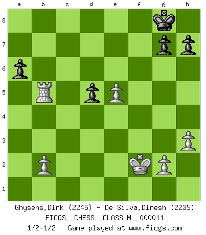 Last move : 1/2-1/2 2007 November 5 1:51:17 [Event "FICGS__CHESS__CLASS_M__000011"] [Site "FICGS"] [Date "2007.05.19"] [Round "1"] [White "Ghysens,Dirk"] [Black "De Silva,Dinesh"] [Result "1/2-1/2"] [WhiteElo "2245"] [BlackElo "2235"] 1.e4 c5 2.Nf3 d6 3.d4 cxd4 4.Nxd4 Nf6 5.Nc3 a6 6.f4 e5 7.Nf3 Nbd7 8.a4 Be7 9.Bc4 Qa5 10.Qe2 O-O 11.O-O exf4 12.Bxf4 Ne5 13.Nd5 Nxd5 14.Bxd5 Be6 15.Bxe6 Nxf3+ 16.Qxf3 fxe6 17.Qb3 Qc5+ 18.Be3 Qc8 19.Rxf8+ Bxf8 20.a5 Qd7 21.Rd1 Rc8 22.h3 Be7 23.e5 d5 24.c4 Bc5 25.cxd5 Qb5 26.Rd3 Qxb3 27.Rxb3 Bxe3+ 28.Rxe3 exd5 29.Rb3 Rc5 30.Rxb7 Rxa5 31.Kf2 Rb5 32.Rxb5 1/2-1/2 Sicilian : Najdorf, 6.f4 Kingside Castling by player Black (move 10) Kingside Castling by player White (move 11) This chess game ended in a draw. Follow this game move after move (download)The mistakes are there, waiting to be made. (Savielly Tartakower) Es genügt nicht ein guter Spieler zu sein, man muß auch gut spielen. (Siegbert Tarrasch) Los Peones son nacidos libres, y aún así, se encuentran por doquier encadenados. (Rick Kennedy) Karpov est une pièce de musée. (Garry Kasparov) The smarter you play, the luckier you'll be. (Mark Pilarski)