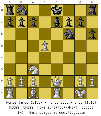 Last move : 1-0 2018 October 5 13:23:47 [Event "FICGS__CHESS__KING_SUPERTOURNAMENT__000003"] [Site "FICGS"] [Date "2018.09.16"] [Round "1"] [White "Romig,James"] [Black "Horoshilov,Andrey"] [Result "1-0"] [WhiteElo "2135"] [BlackElo "1713"] 1.e4 e5 2.f4 d5 3.exd5 Qxd5 4.Nc3 Qe6 5.fxe5 Qxe5+ 6.Be2 Be6 7.d4 Qf6 8.Nf3 h6 9.O-O Qd8 10.d5 Bg4 11.Ne5 Bxe2 12.Qxe2 Nf6 13.Nc6 Qe7 14.Nxe7 Bxe7 15.Re1 1-0 KGD : Falkbeer counter-gambit Kingside Castling by player White (move 9) Player White won this chess game. Follow this game move after move (download)You know, comrade Pachman, I don't enjoy being a Minister, I would rather play Chess like you. (Che Guevara) Als er Schachweltmeister wurde ließ er praktisch alle stärksten Sovietspieler für sich arbeiten. Wenn ein auch nur mittelmässiger Meister ein Spezialist für eine bestimmte Eröffnung war, wurde er von Karpov gerufen. Das wurde alles geheim gehalten. (Mikhail Moiseyevich Botvinik) No hay precio que sea tan grande por la cabellera del Rey enemigo. (Koblentz) Il s'avisa de me proposer d'apprendre les échecs qu'il jouait un peu... me voilà forcené des échecs. J'achète un échiquier, je m'enferme dans ma chambre, j'y passe des jours et des nuits à vouloir apprendre par cur toutes les parties. (Jean-Jacques Rousseau, Confessions) Knowledge will give you power, but character respect. (Bruce Lee)