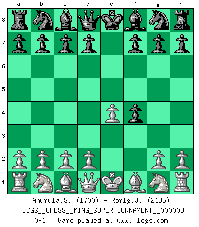 Last move : 0-1 2018 October 16 8:55:46 [Event "FICGS__CHESS__KING_SUPERTOURNAMENT__000003"] [Site "FICGS"] [Date "2018.09.16"] [Round "1"] [White "Anumula,Siddhartha Vijay Raj"] [Black "Romig,James"] [Result "0-1"] [WhiteElo "1700"] [BlackElo "2135"] 1.e4 e5 2.f4 exf4 0-1 This chess game has been lost on time (started : 2018.09.16 2:52:46) King's gambit accepted Player Black won this chess game. Follow this game move after move (download)Chess is a terrific way for kids to build self image and self esteem. (Saudin Robovic) Ohne Leiden bildet sich kein Charakter. (Ernst Freiherr von Feuchtersleben) Todavía soy una víctima del Ajedrez. Tiene toda la belleza del arte y mucho mas. No puede ser comercializado. El Ajedrez es mas puro que el arte en su posición social. (Marcel Duchamp) D'abord les bases : Jouez et étudiez, puis étudiez et jouez, ensuite jouez et étudiez, puis étudiez et jouez. Deuxièmement : Donnez toujours le meilleur de vous-même ! (Ken Smith) Optimism is a variety of information deficit. Sometimes especially true for correspondence chess games. (Michael Aigner)