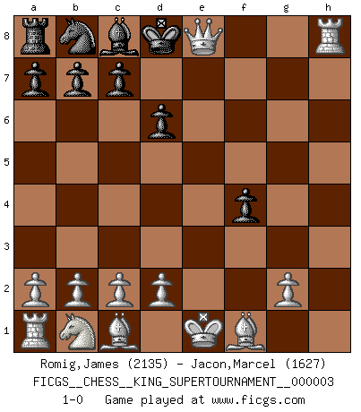 Last move : 1-0 2018 September 20 18:41:54 [Event "FICGS__CHESS__KING_SUPERTOURNAMENT__000003"] [Site "FICGS"] [Date "2018.09.16"] [Round "1"] [White "Romig,James"] [Black "Jacon,Marcel"] [Result "1-0"] [WhiteElo "2135"] [BlackElo "1627"] 1.e4 e5 2.f4 exf4 3.Nf3 Nf6 4.e5 Ng4 5.h3 f5 6.hxg4 fxg4 7.Nd4 Bc5 8.Qxg4 Bxd4 9.Qxg7 Qe7 10.Qxh8+ Qf8 11.Qxh7 Bxe5 12.Qh5+ Kd8 13.Qxe5 Qe8 14.Rh8 d6 15.Qxe8+ 1-0 KGA : Schallop defense Player White won this chess game. Follow this game move after move (download)Botvinnik tried to take the mystery out of Chess, always relating it to situations in ordinary life. He used to call Chess a typical inexact problem similar to those which people are always having to solve in everyday life. (Garry Kasparov) Deine Wertungszahl - vorausgesetzt einige Jahre schachliche Anstrengung - entspricht etwa dem zehnfachen Deines IQ plus 1000. (Jonathan Levitt) ¿Se han dado cuenta de que Fischer casi nunca ha tenido piezas malas? El las intercambia y las piezas malas se quedan con sus oponenets. (Yuri Balashov) Le pion, dans sa simplicité, marche droit devant lui, mais lorsqu'il prend, il le fait obliquement? Ainsi l'homme, tant qu'il reste pauvre, marche dans la droiture et vit honnêtement, mais lorsqu'il recherche les honneurs, il flatte, se parjure et, par les voies obliques, cherche une position supérieure sur l'échiquier du monde. (Jean de Galles) I teach you to lie, cheat and steal, and as soon as my back's turned you wait in line ? (Gregory House, House M.D.)