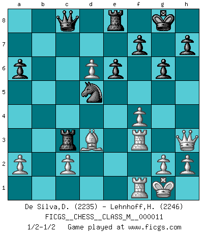 Last move : 1/2-1/2 2007 October 28 16:55:49 [Event "FICGS__CHESS__CLASS_M__000011"] [Site "FICGS"] [Date "2007.05.19"] [Round "1"] [White "De Silva,Dinesh"] [Black "Lehnhoff,Heinz-Georg"] [Result "1/2-1/2"] [WhiteElo "2235"] [BlackElo "2246"] 1.e4 c5 2.Nf3 e6 3.d4 cxd4 4.Nxd4 Nc6 5.Nc3 Qc7 6.Be2 Nf6 7.Be3 a6 8.O-O Bb4 9.Na4 Be7 10.Nxc6 bxc6 11.Nb6 Rb8 12.Nxc8 Qxc8 13.Bd4 c5 14.Be5 Rb6 15.Qd3 d6 16.Bc3 O-O 17.b3 d5 18.e5 Nd7 19.f4 c4 20.bxc4 Rc6 21.Qh3 Nb6 22.Bd3 g6 23.Rf3 Re8 24.cxd5 Rxc3 25.d6 Bxd6 26.exd6 Nd5 27.Raf1 1/2-1/2 Sicilian : Taimanov (Bastrikov) variation Kingside Castling by player White (move 8) Kingside Castling by player Black (move 16) This chess game ended in a draw. Follow this game move after move (download)You must take your opponent into a deep dark forest where 2+2=5, and the path leading out is only wide enough for one. (Mikhail Tal) Wer nie einen Fehler gemacht hat, hat nie etwas Neues ausprobiert. (Albert Einstein) El Ajedrez, como cualquier otra actividad creativa, puede existir solo a través de méritos combinados de aquellos que tienen talento creativo y de aquellos que tienen la habilidad de organizar un trabajo creativo. (Mikhail Botvinnik) Le pion, dans sa simplicité, marche droit devant lui, mais lorsqu'il prend, il le fait obliquement? Ainsi l'homme, tant qu'il reste pauvre, marche dans la droiture et vit honnêtement, mais lorsqu'il recherche les honneurs, il flatte, se parjure et, par les voies obliques, cherche une position supérieure sur l'échiquier du monde. (Jean de Galles) I teach you to lie, cheat and steal, and as soon as my back's turned you wait in line ? (Gregory House, House M.D.)